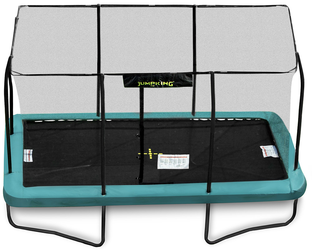 The JumpKing 9 ft x 13 ft Rectangular V2 Trampoline offers a high-performance jumping surface in a compact rectangular format, ideal for controlled bounce and improved performance. Features: Fully stitched-in enclosure for added safety, with an elegant and easy-to-assemble design. Horizontal quick-fit shock-corded rods ensure a secure enclosure. Unique Tri-Layer socket enhances durability and removes the need for brackets. Fully fastened entry/exit door for safety. Durable black powder-coated steel frame. Manufactured by JumpKing, a leading trampoline manufacturer. Advanced over and under Eurospring design improves performance and reduces frame stress. MORE IMAGES: